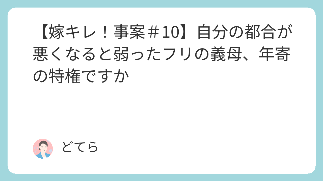 自分の都合が悪いときは話を逸らしたり、具合が悪く弱ってるフリしたり。仮病つかっておいて、かわいそうなんて1ミリも思いませんよ。都合良く嫁を使おうなんて昭和と共に終わってる、時代遅れもいいところ。