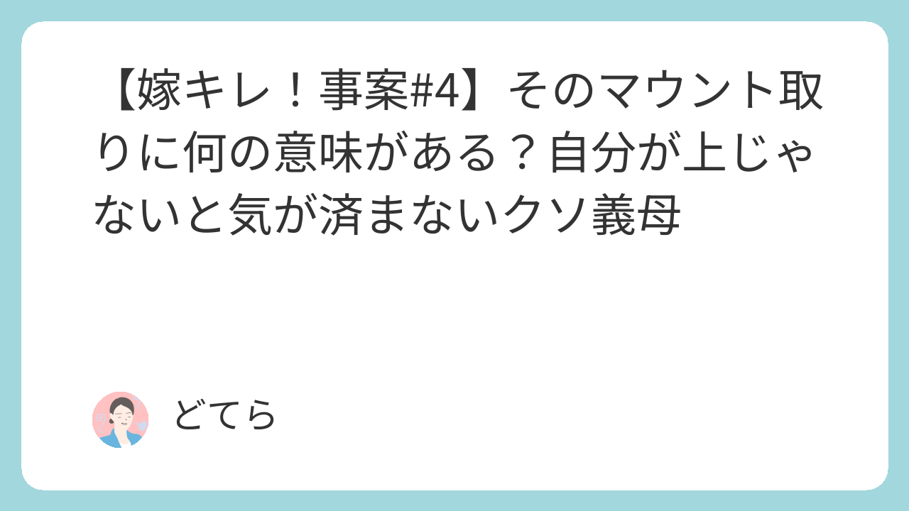 マウントが出た時点でみんなが「また出たよ」とシーンとなり、今ではクソ義母とは誰も話したがらない。唯一、夫がクソ義母の上を行きマウント返しをしてくれるので清々するが、時には負けじとバレバレの嘘をついてくる。マウント取りに必死なクソ義母、浅はかなババアである。